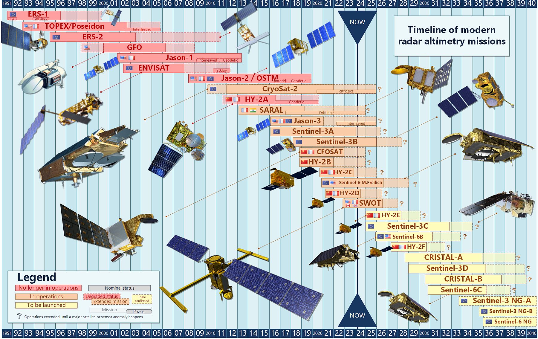 ![]() | Zeitleiste mit Altimetriemissionen von NASA, NOAA, CAST, ISRO und ESA Quelle: AVISO+ |