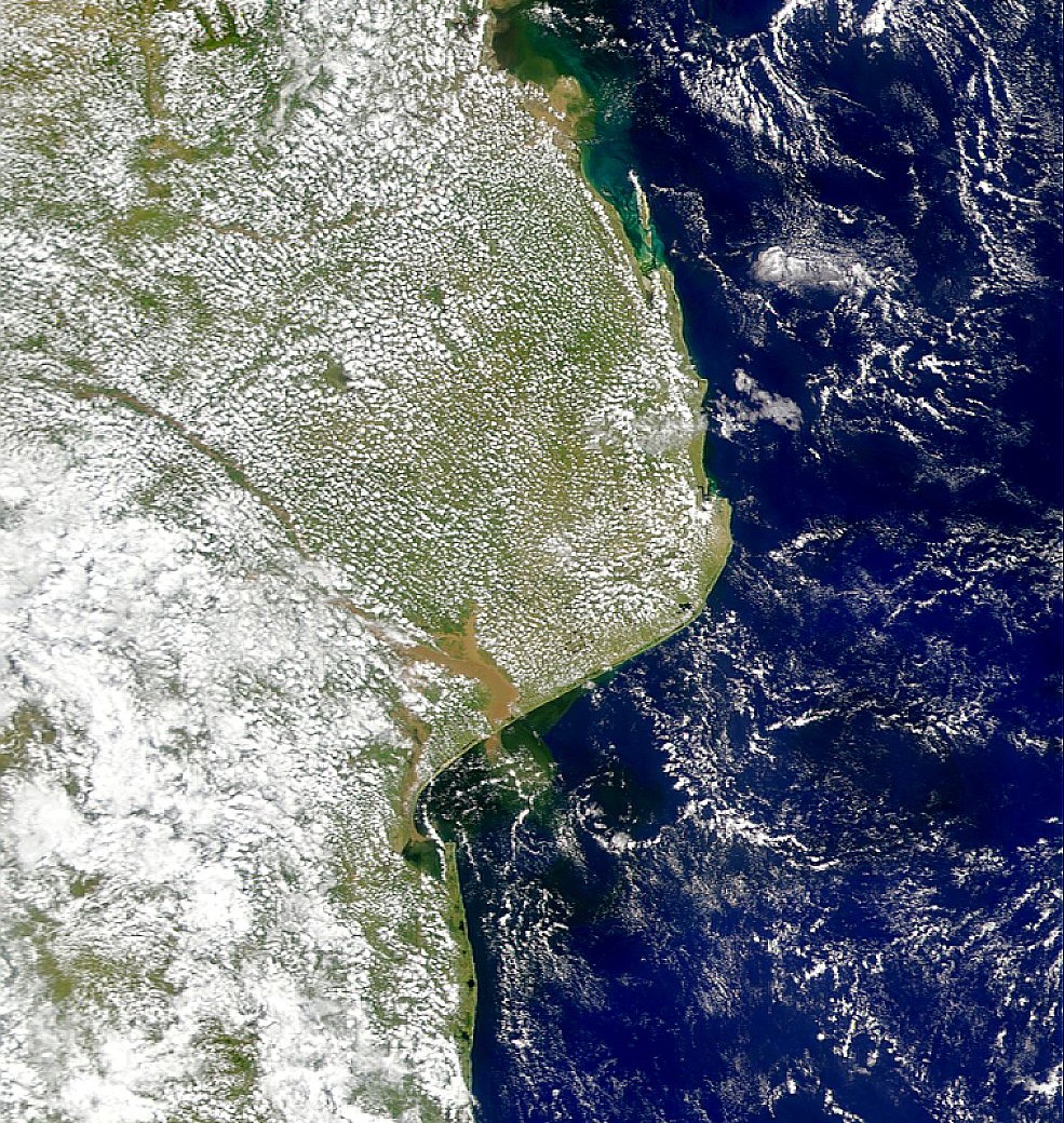Links und Mitte: Satellitenbilder vor und während der Flut in Mosambik Dieses Bildpaar von Landsat 7 zeigt das unglaubliche Ausmaß der Überschwemmungen, die derzeit in Mosambik auftreten. Ein Monat mit Dauerregen und zwei Wirbelstürme ließen den Limpopo-Fluss stellenweise auf 80 km Breite anschwellen. Mindestens mehrere hundert Menschen wurden getötet, und über eine Million wurden aus ihren Häusern vertrieben. Die Überschwemmungen reduzierten das BIP des Landes um 45 %. Rechts: Der angeschwollene Limpopo-Fluss ist in diesem SeaWiFS-Überflug über die Küstenlinie von Mosambik zu sehen. Schwebstoffe sind vor der Küste 40 bis 50 Meilen von der Flussmündung entfernt zu sehen. Ähnliche Sedimentfahnen sind vom Save-Fluss und einem weiteren, weiter nördlich gelegenen Fluss zu erkennen. Sensor: OrbView-2/SeaWiFS. Data Start Date: 3/2/00. |