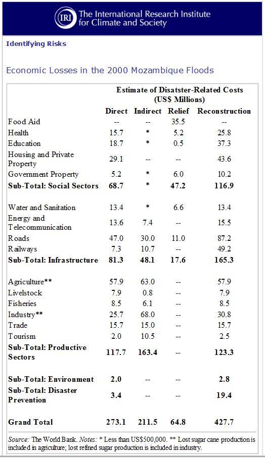 Bereits 1999 litt Mozambik unter den bis dahin schlimmsten Überflutungen seit Jahrzehnten. Damals war die Lage vornehmlich in den südlichen Landesteilen durch die stark verlangsamte Wasseraufnahmefähigkeit der Böden verschärft, die durch eine verheerende Dürre der vorangegangenen El Niño-Episode verbacken waren.
