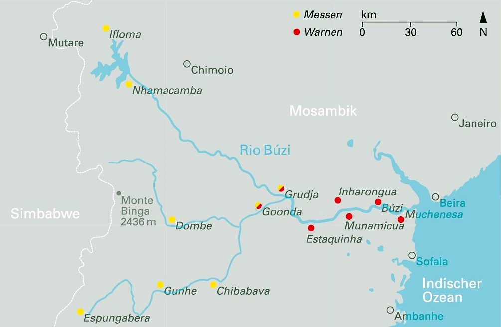 Funktionierende Warnsysteme sind ein wesentlicher Bestandteil effektiver Prävention. Vertreter der GIZ, die seit Jahren im Land aktiv sind, entwickelten hier ein Warnsystem, das genau auf die Bedürfnisse der Menschen und ihre Fähigkeiten zugeschnitten ist. Die Funktionsweise ist bestechend einfach: An strategischen Punkten im Einzugsgebiet des Búzi messen Verantwortliche aus den Dörfern den Tagesniederschlag. Zugleich überwachen sie leicht ablesbare Pegelmesser am Fluss. Bei kritischen Niederschlagsintensitäten oder Wasserpegeln geben sie per Funk Meldung. Treffen in der zentralen Koordinierungsstelle Nachrichten ein, die Flächenniederschläge vermuten lassen, wird gewarnt. Die Pegel am Fluss sind wichtige Kontrollstellen.