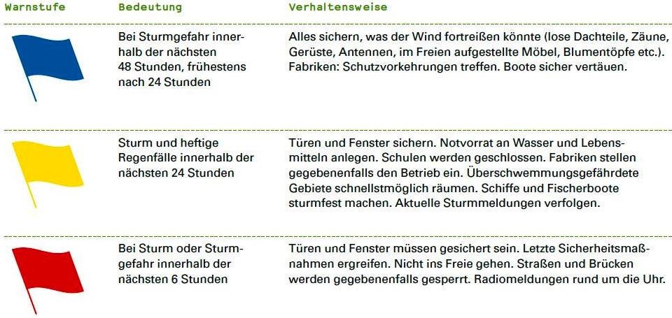 Die Niederschlagsmengen und der Wasserstand der Flüsse werden nun regelmäßig gemessen. Die Informationen darüber werden mit Funkgeräten und Fahrradkurieren verbreitet. Bei Flutgefahr hisst man farbige Flaggen, qualifizierte Helfer verbreiten mit Megaphonen die Warnung, kritische Gebiete werden geräumt.